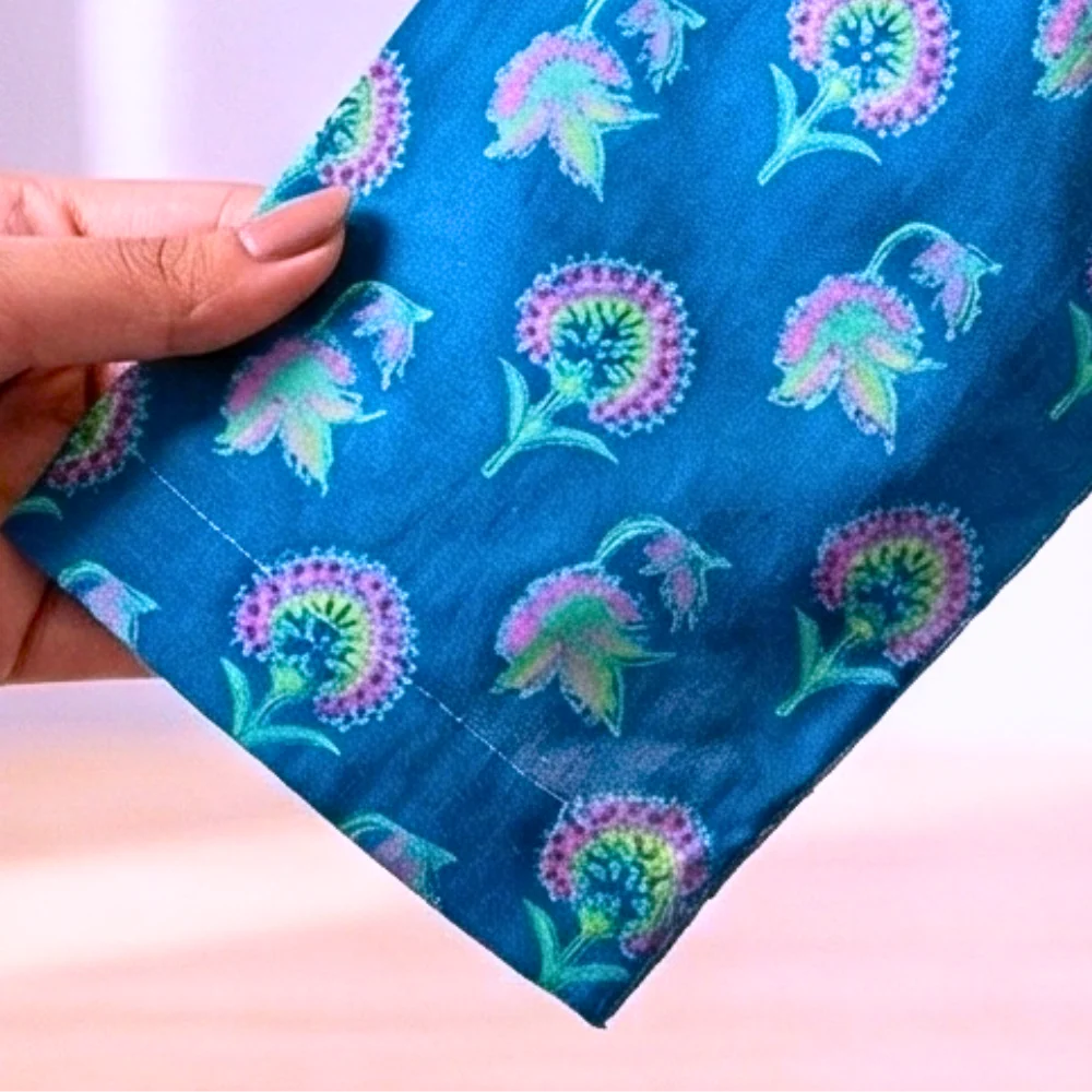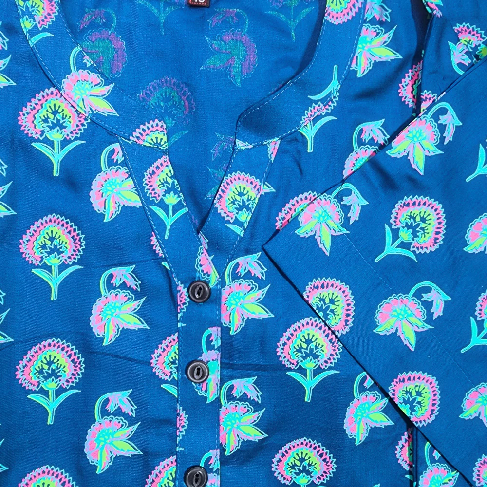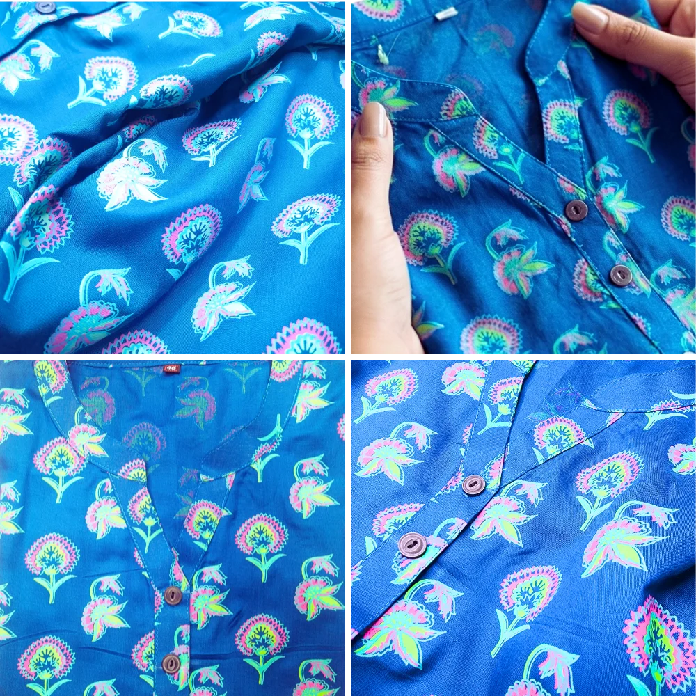 চমৎকার গাঢ় টিল ব্লু (Deep Teal Blue) রঙের ওপর তৈরি এই কুর্তিটিতে রয়েছে হালকা গ্লসি বা চকচকে ফিনিশ, যা আপনার লুকে আভিজাত্যের ছোঁয়া এনে দেবে। এর পুরো জমিনজুড়ে অল-ওভার ফ্লোরাল ব্লক প্রিন্ট করা হয়েছে। গাঢ় ব্যাকগ্রাউন্ডের ওপর উজ্জ্বল নিওন গোলাপি এবং লাইম সবুজ রঙের ফুলের নকশাগুলো একটি আকর্ষণীয় কন্ট্রাস্ট তৈরি করেছে। যেকোনো অনুষ্ঠানে পরার জন্য এটি একটি পারফেক্ট চয়েস।