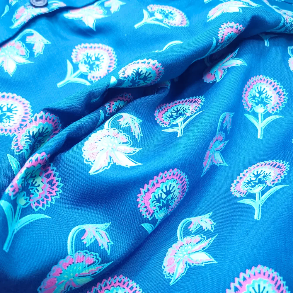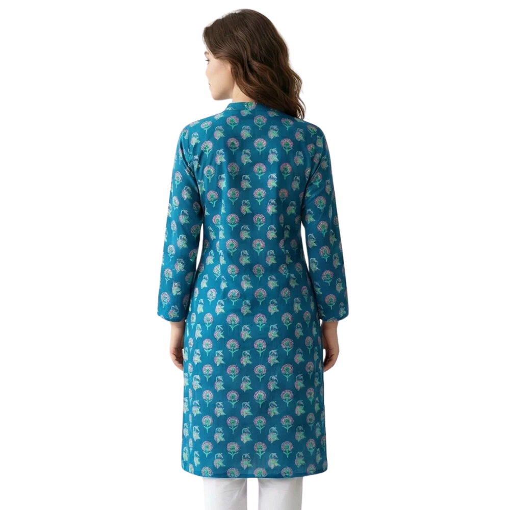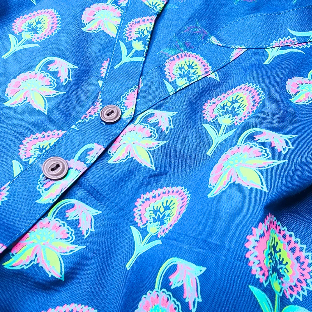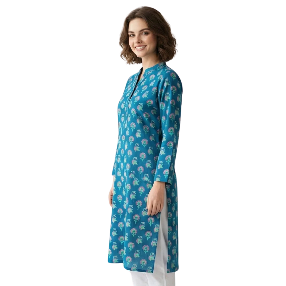 চমৎকার গাঢ় টিল ব্লু (Deep Teal Blue) রঙের ওপর তৈরি এই কুর্তিটিতে রয়েছে হালকা গ্লসি বা চকচকে ফিনিশ, যা আপনার লুকে আভিজাত্যের ছোঁয়া এনে দেবে। এর পুরো জমিনজুড়ে অল-ওভার ফ্লোরাল ব্লক প্রিন্ট করা হয়েছে। গাঢ় ব্যাকগ্রাউন্ডের ওপর উজ্জ্বল নিওন গোলাপি এবং লাইম সবুজ রঙের ফুলের নকশাগুলো একটি আকর্ষণীয় কন্ট্রাস্ট তৈরি করেছে। যেকোনো অনুষ্ঠানে পরার জন্য এটি একটি পারফেক্ট চয়েস।