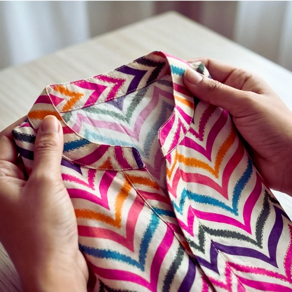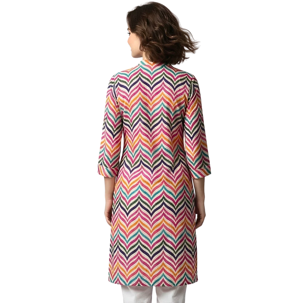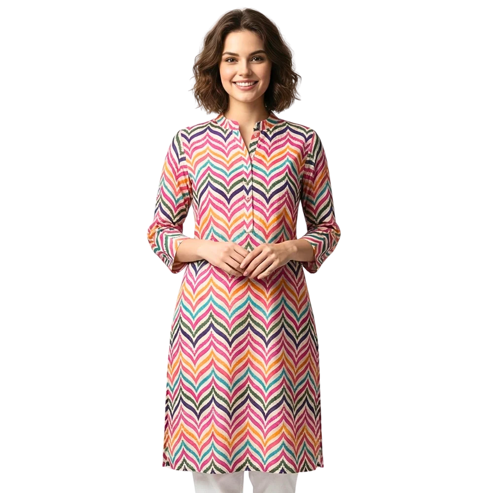 ১০০% প্রিমিয়াম সুতি কাপড়ের তৈরি এই কুর্তিটিতে রয়েছে নজরকাড়া মাল্টিকালার জিগজ্যাগ প্রিন্ট, যা আপনাকে দিবে এক অনন্য ও স্টাইলিশ লুক। হালকা ক্রিম রঙের ওপর গোলাপি, কমলা ও ফিরোজা রঙের প্রাণবন্ত স্ট্রাইপগুলো কুর্তিটিকে অত্যন্ত আধুনিক করে তুলেছে। গলার অংশে কাঠের ছোট বোতাম এবং নিখুঁত ফিনিশিং একে অফিস বা ক্যাজুয়াল আউটিংয়ের জন্য সেরা পছন্দে পরিণত করেছে।